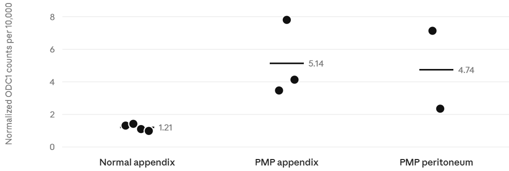 Mean normalized ODC1 pseudobulk counts increased from 1.21 per 10,000 in normal appendix to 5.14 in PMP appendix and 4.74 in PMP peritoneum. Although formal negative binomial models remained statistically imprecise due to limited patient numbers, the normalized abundance values were concordant with the regression estimates and reinforce the interpretation that ODC1 is elevated in PMP tumor epithelium.