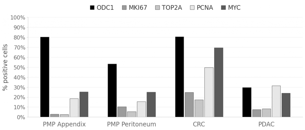 A defining feature of the PMP epithelial compartment is the divergence between relatively high ODC1 prevalence and low classical proliferation markers. In SM appendix tumor epithelium, ODC1 reached 80.16% while MKI67 and TOP2A remained at only 2.98% and 2.72%, respectively. PMP peritoneum showed a somewhat more mixed profile (ODC1 53.32%, MKI67 10.44%, TOP2A 5.54%) but remained far less proliferative than CRC, where ODC1 was similarly high (80.54%) yet accompanied by markedly elevated MKI67 (24.70%) and TOP2A (17.26%). PDAC showed lower ODC1 overall (29.75%) with intermediate proliferative activity, reinforcing that in PMP, particularly in appendix tumor epithelium, ODC1 is deployed in a comparatively low-proliferation context.