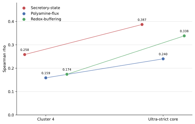Figure 7B. AOC1 aligns more strongly with the PMP secretory-state program than with polyamine flux, particularly in the ultra-strict malignant core.