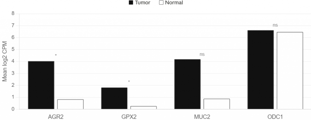 Figure 8A. Bulk RNA-seq (GSE228376): tumor vs normal expression for AGR2, GPX2, MUC2, and ODC1.