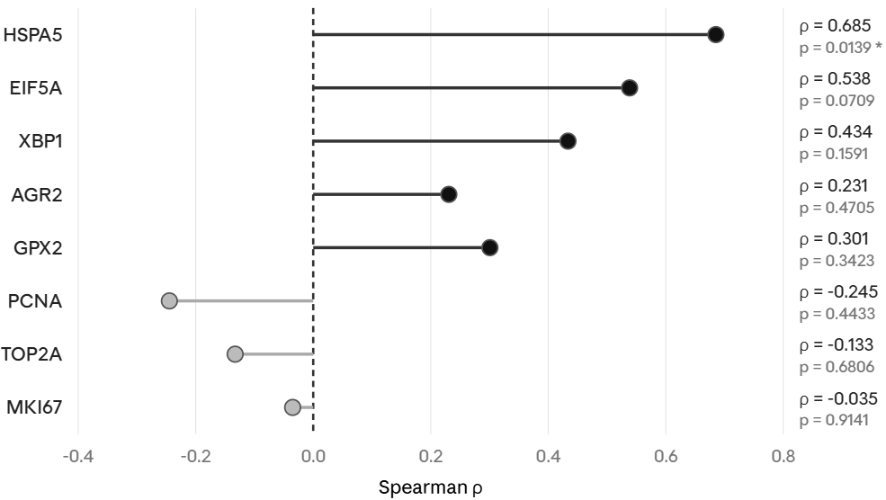 This pattern is consistent with bulk RNA-seq preferentially capturing dominant mucinous and stress-associated phenotypes while underrepresenting context-dependent support genes such as ODC1 that are also expressed in normal secretory epithelium. Within tumor samples, however, ODC1 remained linked to the stress-support program: it correlated most strongly with HSPA5 (rho = 0.685, p = 0.0139) and more modestly with EIF5A (rho = 0.538, p = 0.0709) and XBP1 (rho = 0.434, p = 0.1591), while remaining uncoupled from proliferation markers (MKI67, TOP2A, PCNA). The bulk data therefore provide secondary support for the stress-associated context of the axis while illustrating why single-cell resolution is required to appreciate ODC1 enrichment in the malignant compartment.