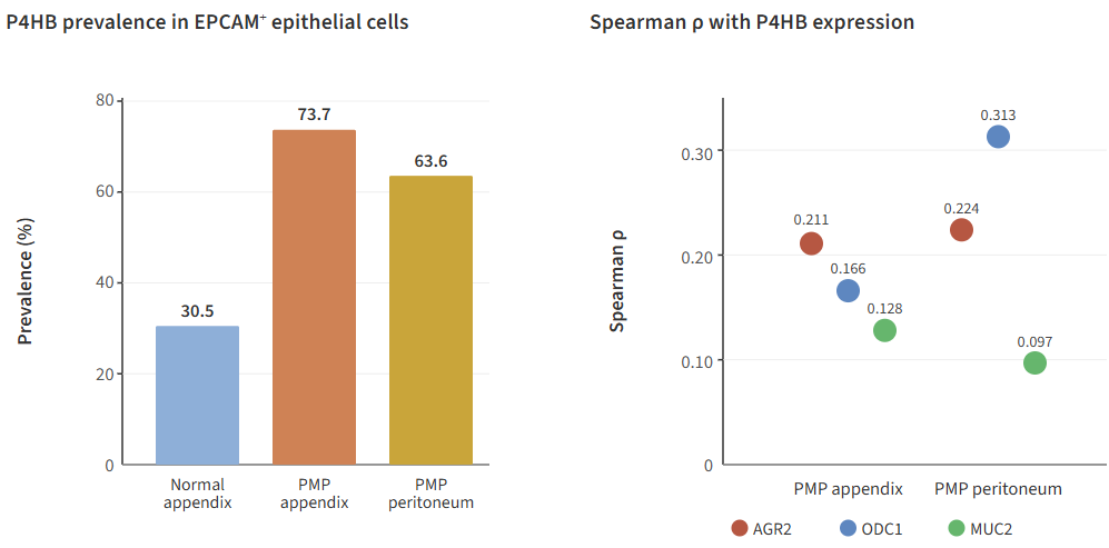 Within EPCAM+ tumor cells, P4HB aligned more closely with AGR2 than with ODC1 in appendix (rho = 0.211 vs 0.166), whereas in peritoneal disease it aligned more closely with ODC1 than with AGR2 (rho = 0.313 vs 0.224). In both compartments, its relationship to MUC2 was weaker (rho = 0.128 in appendix, 0.097 in peritoneum), consistent with a role in secretory-processing support rather than mucin transcript abundance alone. Taken together, these patterns suggest a model in which translational throughput (ODC1-eIF5A), mucin folding (P4HB, AGR2), and ER maintenance (SEC62) are coordinated to sustain chronic secretory load.
