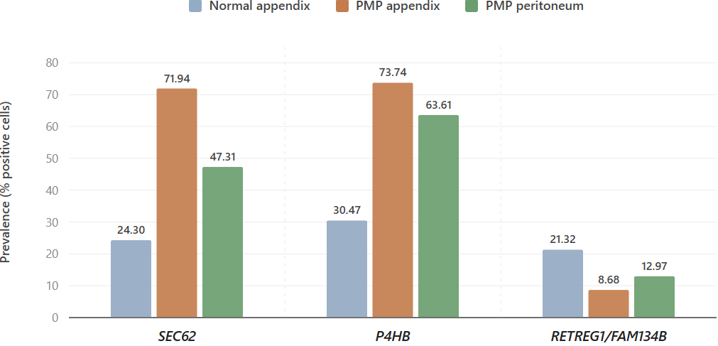 The secretory-support model may extend beyond the polyamine-hypusination axis to include selective reinforcement of ER handling and mucin-folding capacity. In the SM cohort, PMP tumor epithelium showed increased prevalence of SEC62, an ER translocon component implicated in ER maintenance and recovER-phagy, and P4HB, a key disulfide isomerase involved in folding structurally complex secretory proteins such as mucins. Reduced prevalence of RETREG1/FAM134B, which mediates ER-sheet turnover through selective ER-phagy, may reflect avoidance of broad ER-sheet degradation in cells that depend on maintaining a high-capacity secretory apparatus.