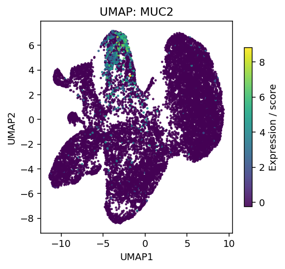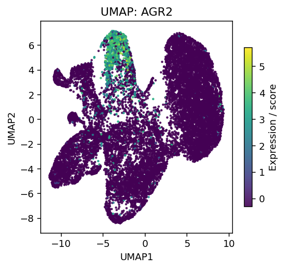 Figure 2. Atlas-level UMAPs for MUC2 (left) and AGR2 (right), confirming co-enrichment in the malignant mucinous compartment.