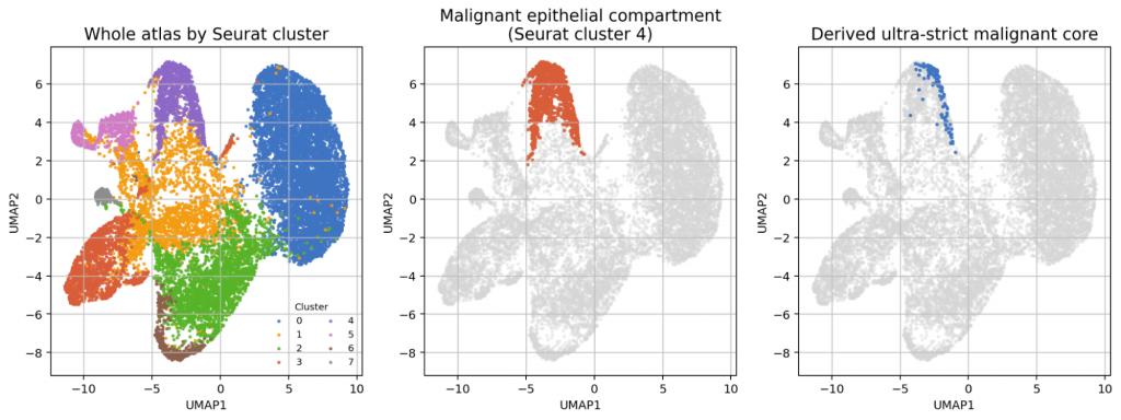 Figure 1. Integrated PMP atlas overview. Left: whole-atlas clustering. Centre: Seurat cluster 4 (malignant epithelium). Right: ultra-strict malignant core.
