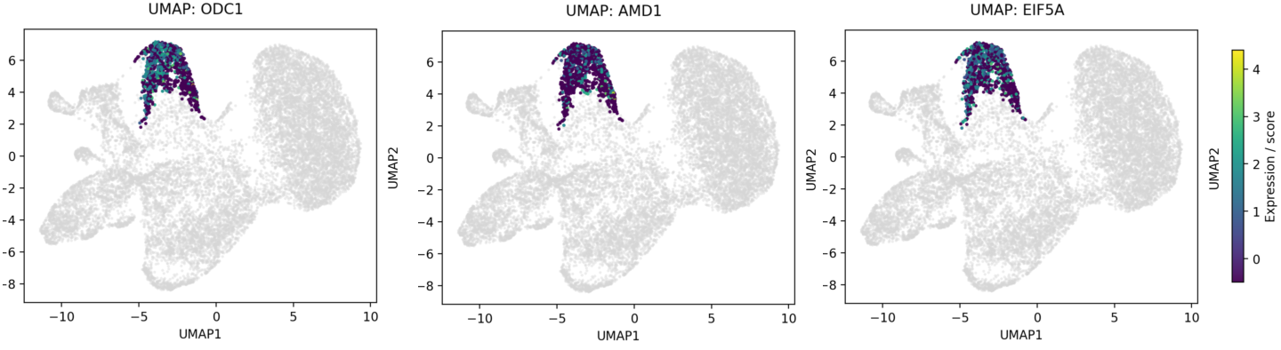 Figure 3. Expression of ODC1, AMD1, and EIF5A within malignant cluster 4, confirming pathway enrichment in the mucinous compartment.